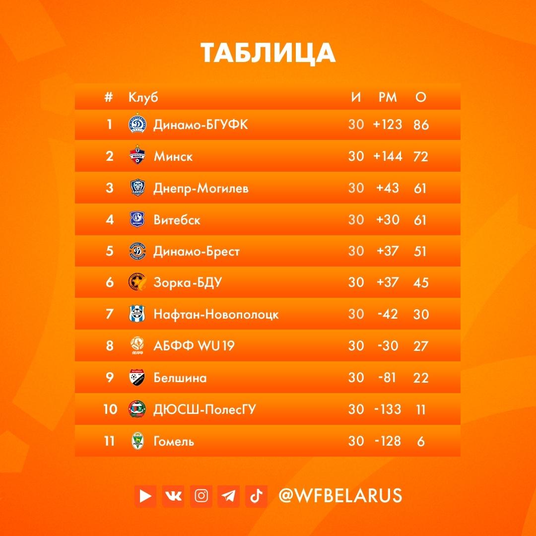 «Витебск» набрал столько же очков, что и могилевский клуб, но уступил ему по дополнительным показателям. При этом игрок команды северной столицы Юлия Дубень вошла в шестерку лучших бомбардиров первенства, забив 19 голов. Ну а «Нафтан» финишировал на седьмом месте – неплохой результат для дебютного сезона команды в высшей лиге первенства.