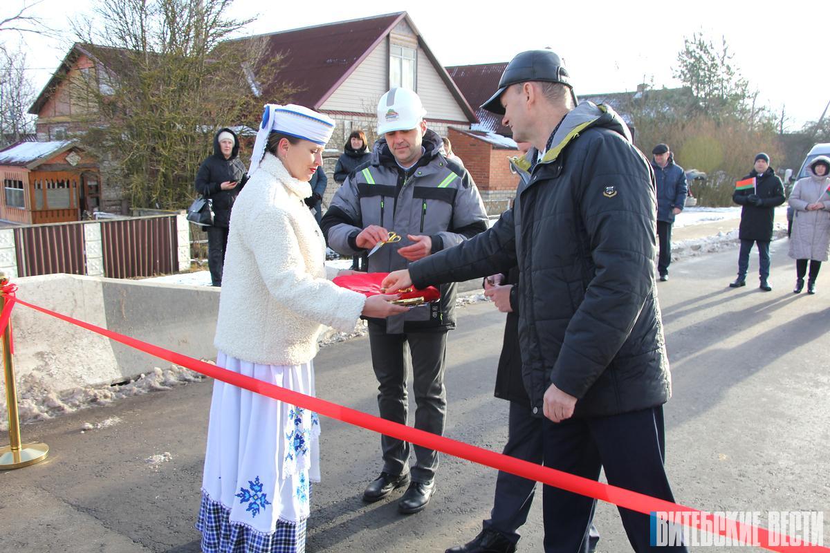 За многолетний добросовестный труд в дорожной отрасли, профессионализм, значительный вклад в строительство и ввод в эксплуатацию объекта почетными грамотами отмечены мастер строительных и монтажных работ филиала ДСУ № 26 ОАО «Дорожно-строительный трест № 1, г. Витебск» Константин Карман, монтажник строительных конструкций филиала «Мостостроительное управление № 5» Максим Рыжиков и бетонщик Василий Утяткин.