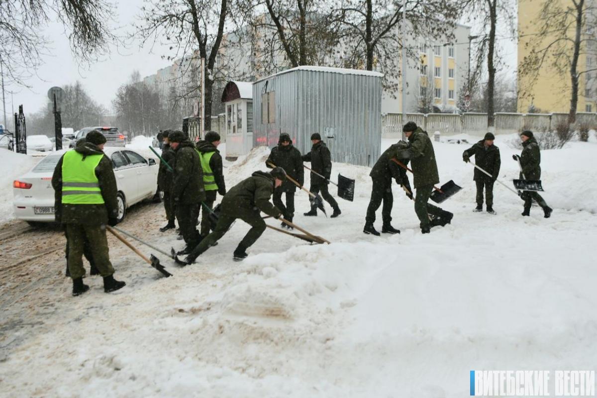 Второй день военнослужащие 103-й Витебской отдельной гвардейской воздушно-десантной бригады шефствуют над Витебской городской клинической больницей скорой медицинской помощи, ликвидируя последствия снегопада.