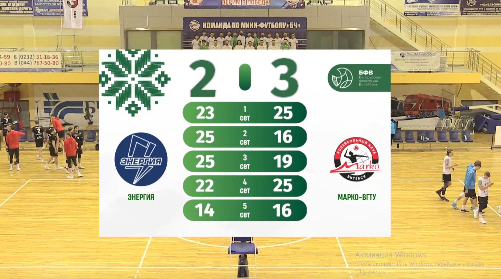 Витебчане выиграли стартовую партию, затем проиграли две подряд, но смогли сравнять счет, ударно проведя четвертый игровой отрезок. Большую часть пятой партии «Марко-ВГТУ» лидировало в счете, но ближе к концовке гомельчане восстановили равновесие (12:12). Пошла равная игра. Но на тай-брейке витебская команда во многом благодаря отличной игре на блоке вырвала победу в сете (16:14), а с ней и в игре (3:2).